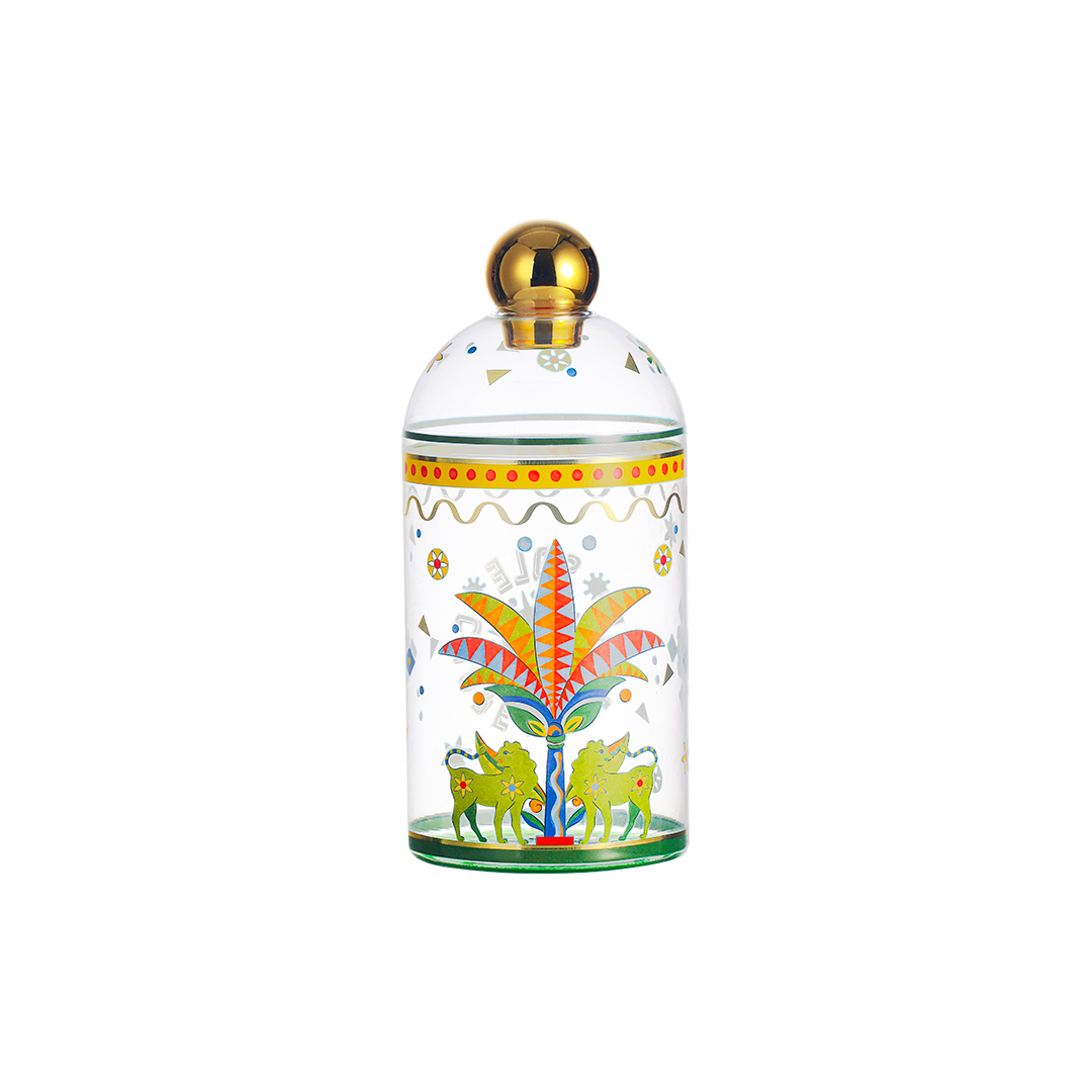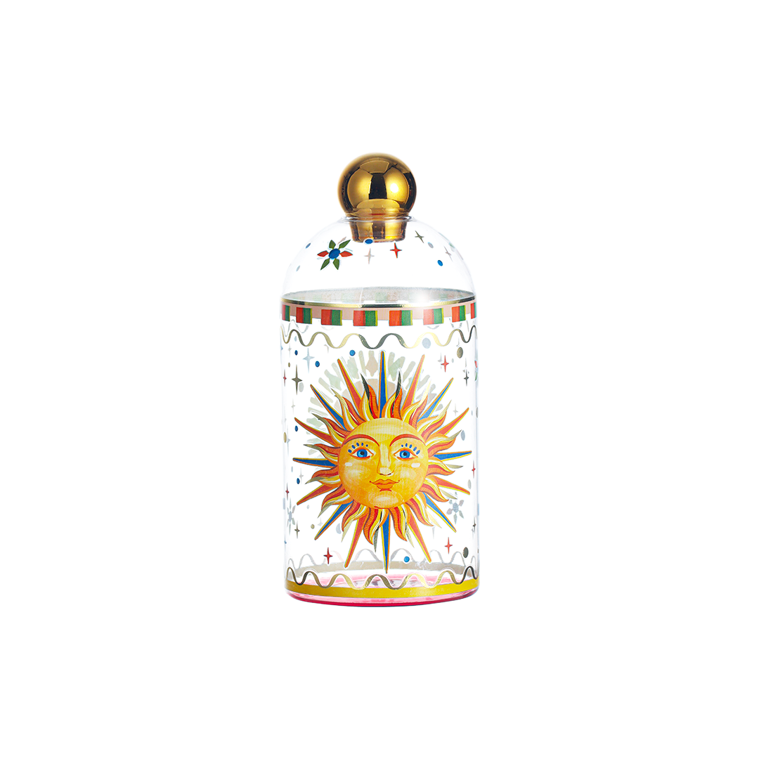 Realizzata in vetro borosilicato di alta qualità, è impreziosita da motivi colorati e simbolici che evocano il sole, la trinacria e la natura mediterranea. Il tappo dorato aggiunge una nota preziosa, trasformando questo diffusore in un elemento decorativo capace di illuminare qualsiasi ambiente con stile e personalità.