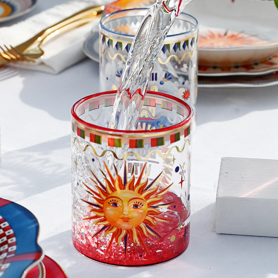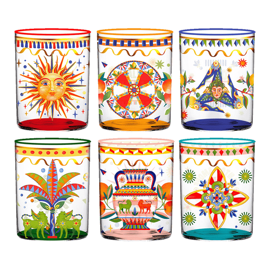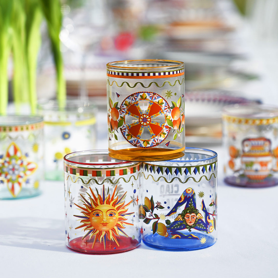 Ogni bicchiere è impreziosito da motivi colorati e simbolici – il sole, la ruota, la trinacria, la palma, l’anfora e il fiore – che evocano l’arte e la luce del Sud Italia. Realizzati in vetro borosilicato resistente, uniscono leggerezza, brillantezza e qualità artigianale.