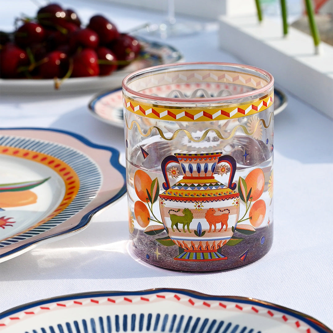 Porta in tavola l’energia del sole e la vivacità del Mediterraneo con il set di 6 bicchieri in vetro decorato Baci Milano della collezione Dolce Vita.