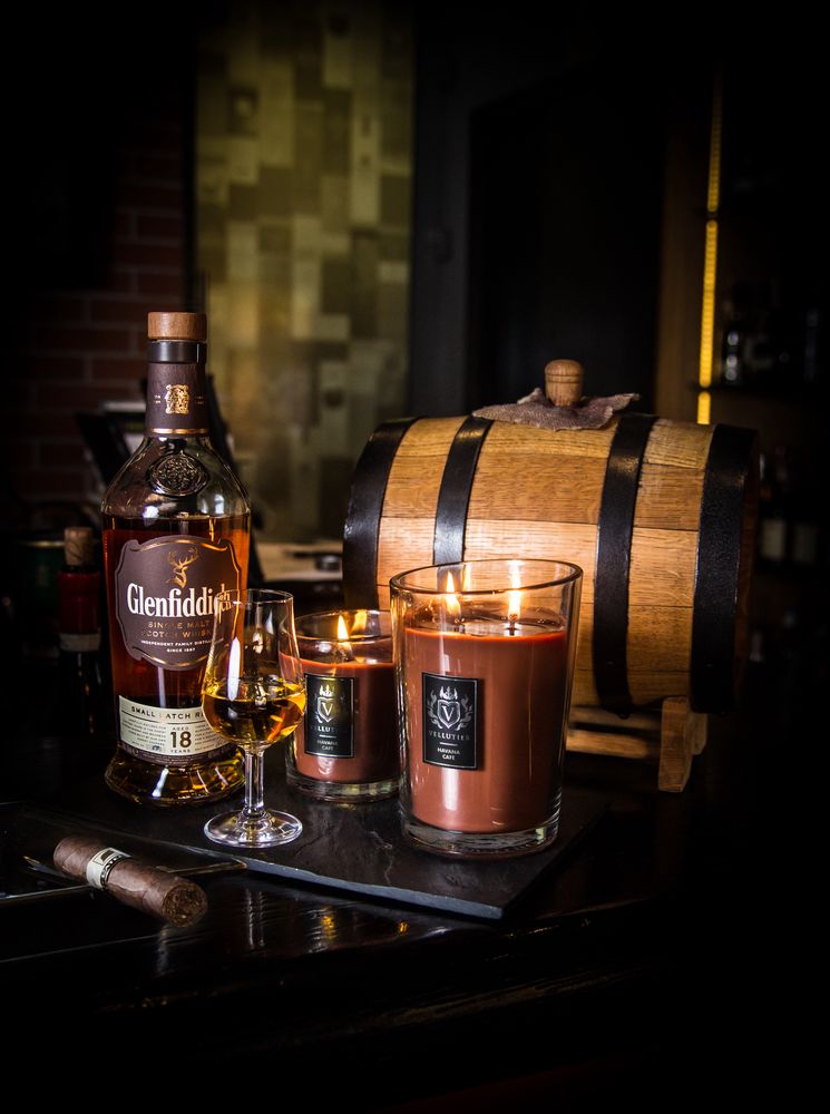 La candela è contenuta in un vetro con un taglio obliquo e un tappo in legno invecchiato, creando un aspetto elegante e originale.