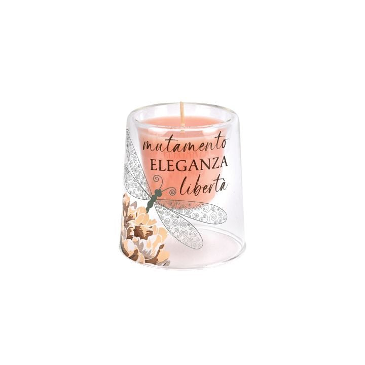 La candela profumata in vetro doppio Libellula Wald è una presenza discreta ma molto caratterizzante. Il contenitore trasparente lascia intravedere la cera color pesca e la decorazione leggera della libellula, accompagnata da parole morbide che sembrano scritte a mano. Non è un oggetto che invade lo spazio: si nota quando ci si avvicina.