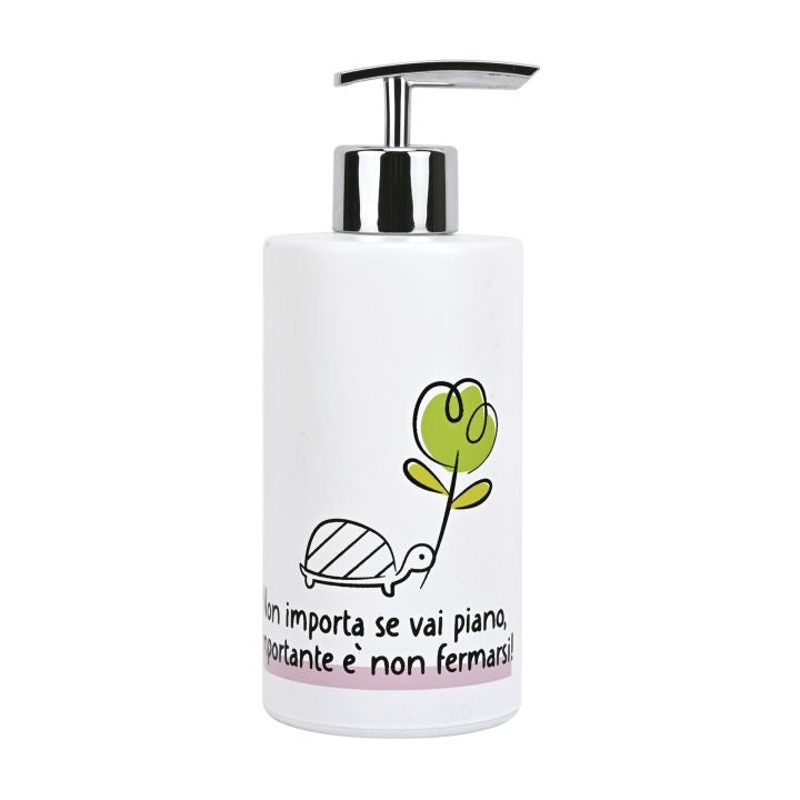 Il dosasapone in vetro bianco "Non Fermarsi Mai" della collezione Positivitime di WALD è un dispenser da 350 ml perfetto per bagno o cucina. La grafica con tartaruga e frase motivazionale rende questo accessorio funzionale un piccolo simbolo di determinazione quotidiana.