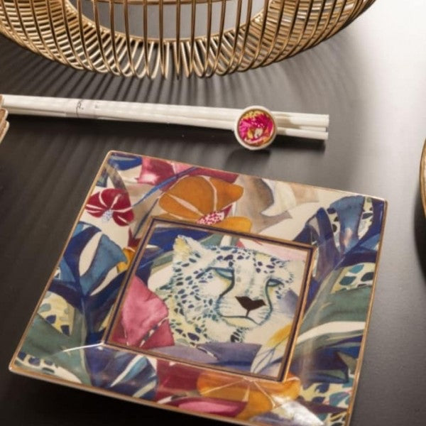 Questo svuotatasche quadrato di BACI MILANO è realizzato in porcellana e arricchito da un bordino in oro zecchino. Offre un design moderno ed elegante, con un ghepardo che emerge dalla ricca vegetazione della savana.