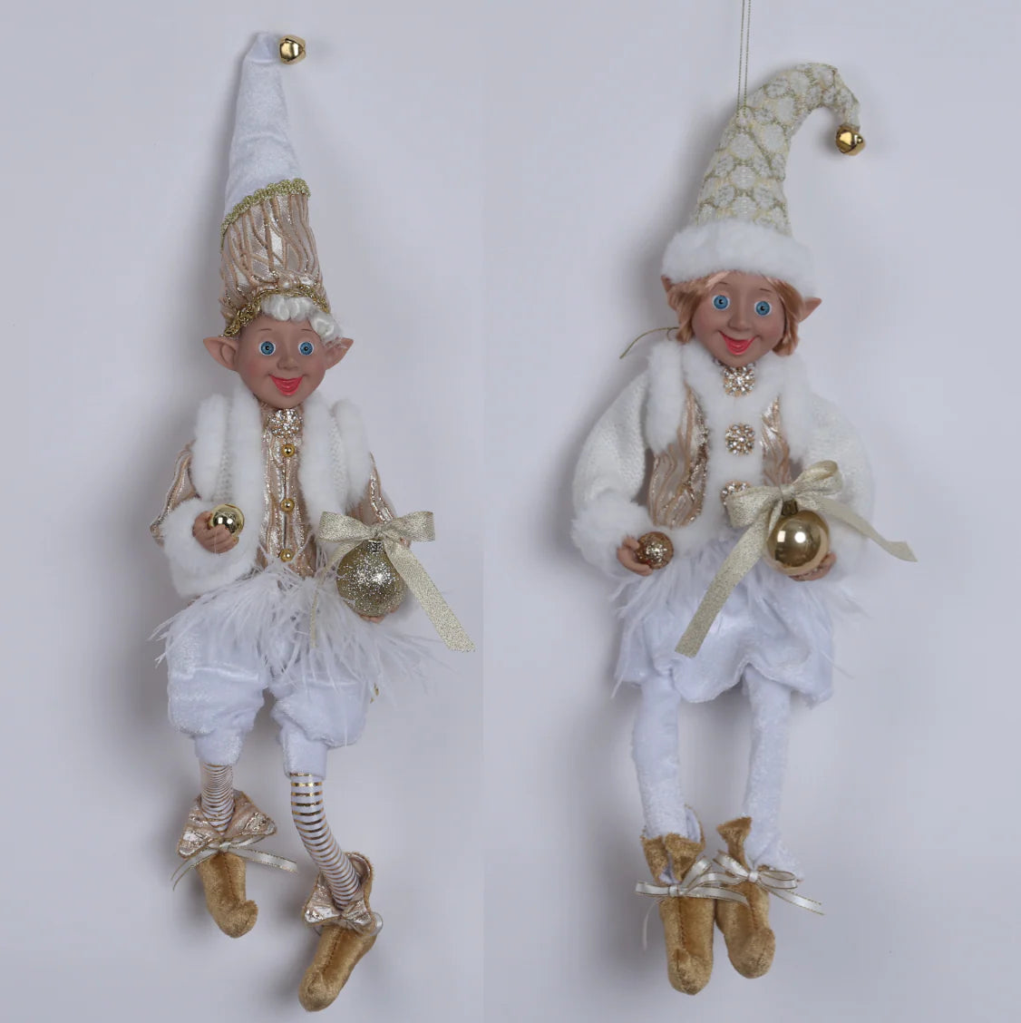ELEGANTE COPPIA DI ELFI DA APPENDERE CON ABITI IN VELLUTO PANNA E ORO E DECORAZIONI 60H