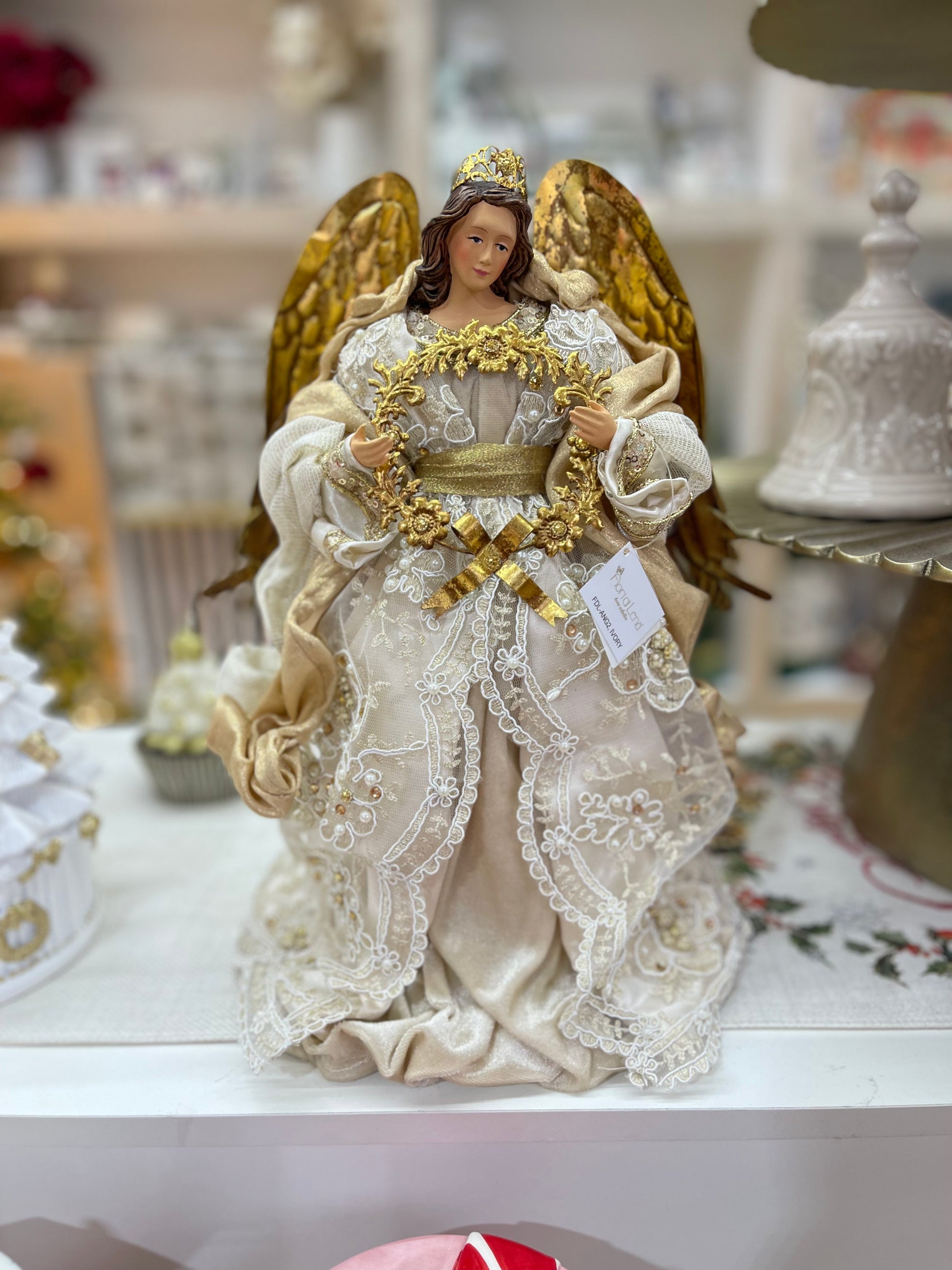 Raffinato angelo natalizio firmato Fiori di Lena, realizzato con un prezioso abito in tessuti avorio e champagne impreziositi da ricami, pizzi e applicazioni decorative. Le magnifiche ali dorate modellate in metallo e la delicata ghirlanda floreale metallica che l’angelo tiene tra le mani rendono questo decoro un pezzo scenografico e di grande eleganza.