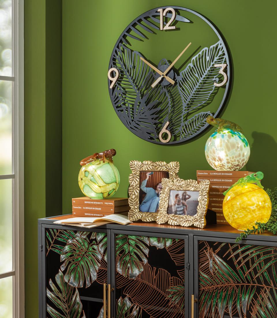 Rinnova le pareti di casa con questo elegante orologio da parete in metallo, caratterizzato da un decoro traforato con foglie tropicali e numeri dorati a rilievo. Un complemento d’arredo che unisce estetica e funzionalità, pensato per chi cerca un orologio grande da parete che diventi il punto focale della stanza.