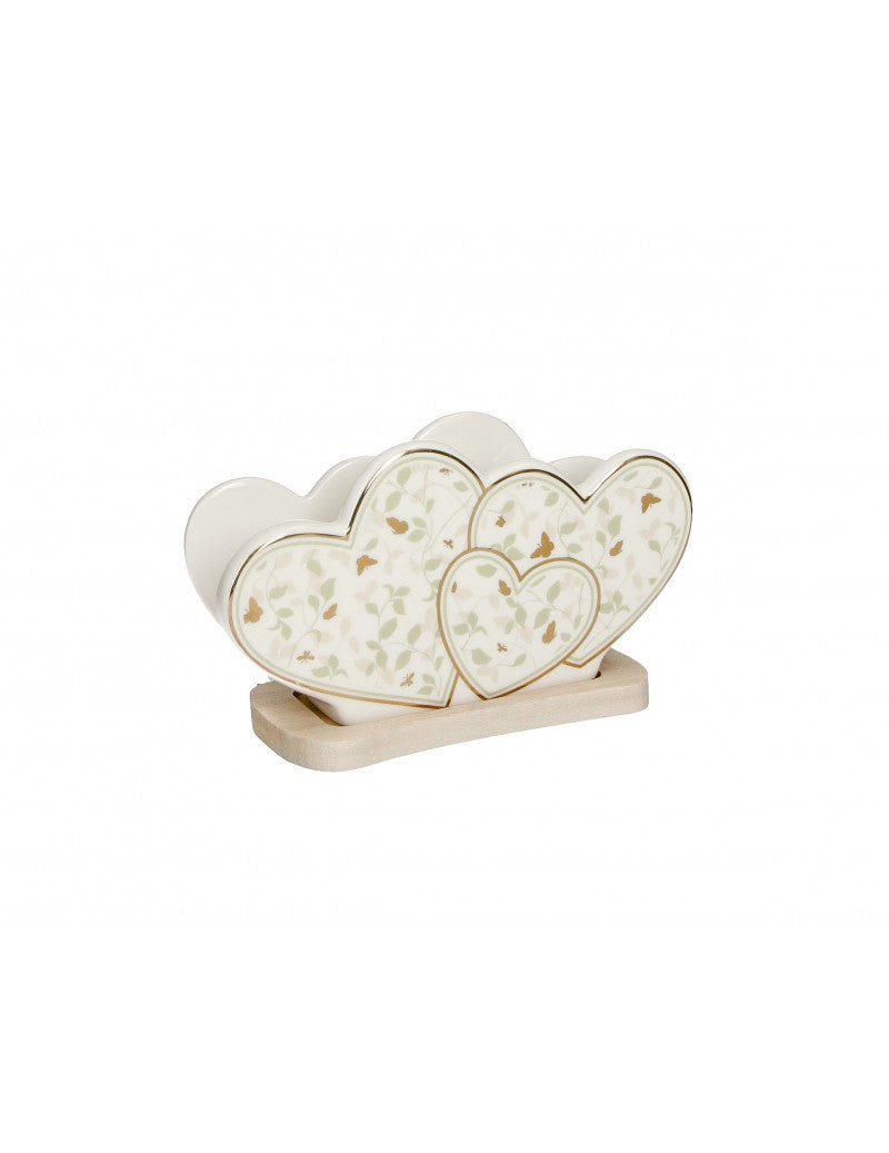 Portatovaglioli cuore della collezione Ali Dorate firmato Brandani, realizzato in porcellana decorata e base in legno naturale. Un accessorio dallo stile romantico e raffinato, perfetto per abbellire la tavola con un tocco di delicatezza.