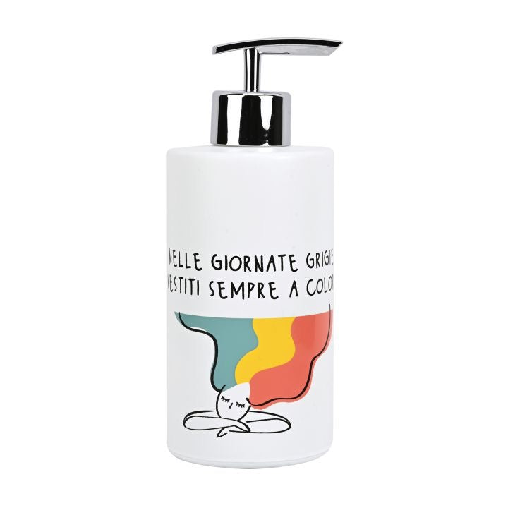 Il dosasapone in vetro bianco "Vestiti a Colori" della collezione Positivitime di WALD è un dispenser per sapone liquido da 350 ml, ideale per bagno e cucina. La grafica colorata e la frase motivazionale portano energia e leggerezza anche nei piccoli gesti quotidiani.