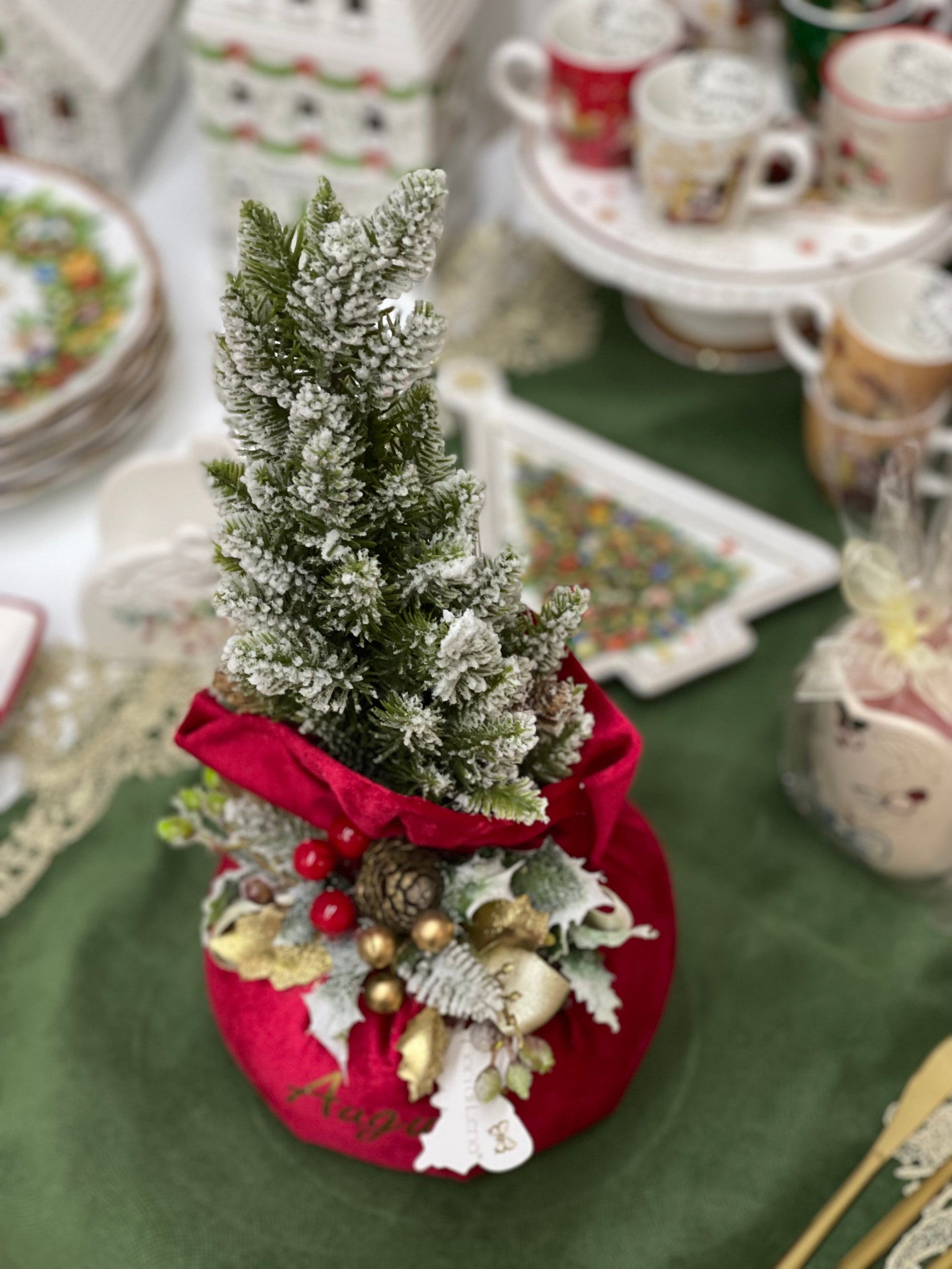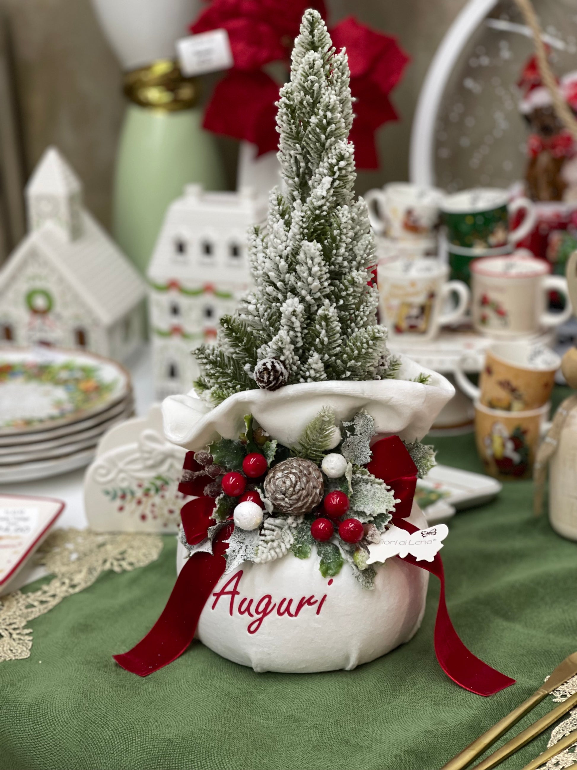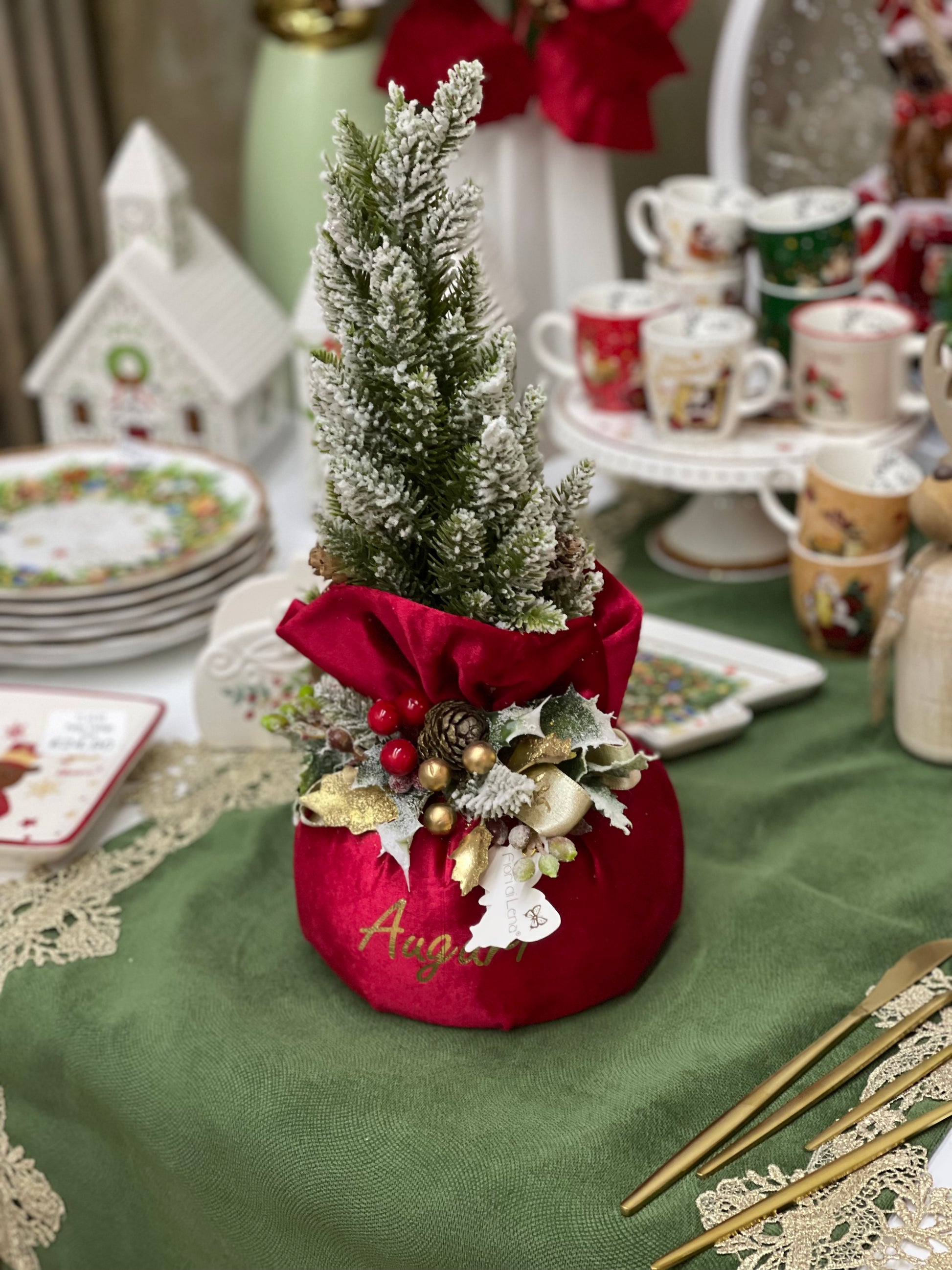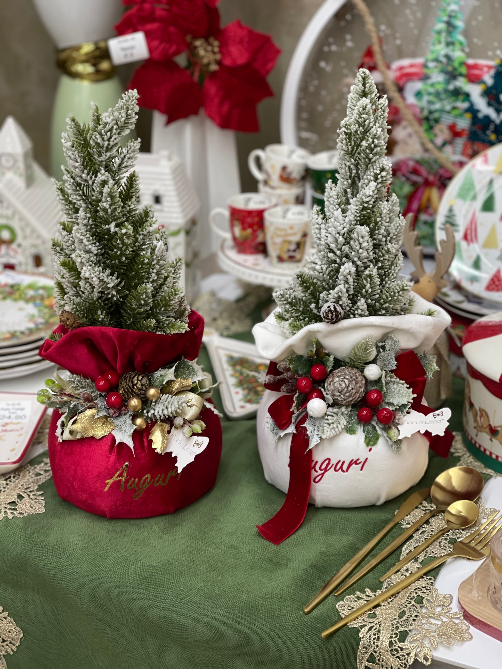 Decora la tua casa con eleganza grazie a questi esclusivi alberelli decorativi innevati, realizzati con cura artigianale. Ogni pezzo è impreziosito da dettagli raffinati, come bacche rosse, pigne e foglie dorate o argentate, e avvolto in un morbido sacchetto di velluto con la scritta "Auguri".
