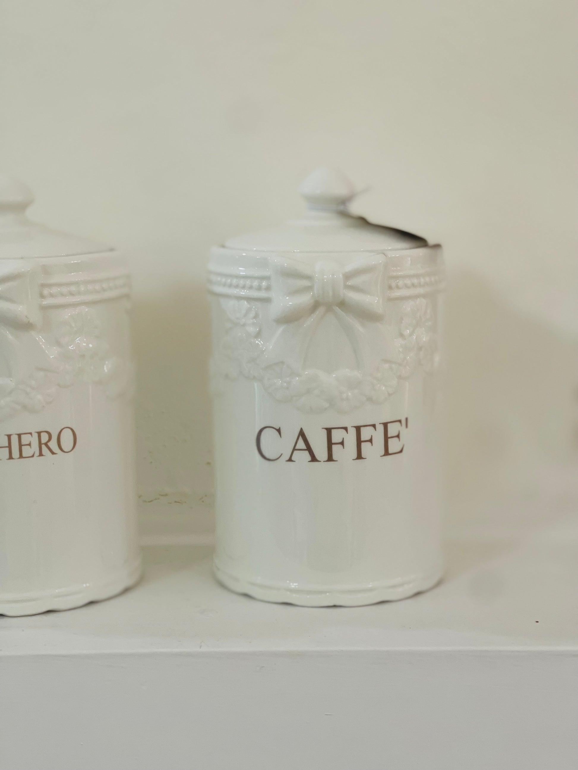Raffinato set di tre barattoli in ceramica bianca firmati L’Arte di Nacchi, pensato per custodire con eleganza sale, zucchero e caffè. Ogni barattolo è impreziosito da un delicato decoro a rilievo con fiocco e ghirlanda floreale, che richiama lo stile shabby chic e dona un tocco romantico alla cucina.