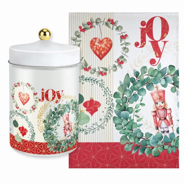 Barattolo in vetro satinato con tappo metallo 11X19H cm e strofinaccio decorato in cotone 100% 50X70 cm