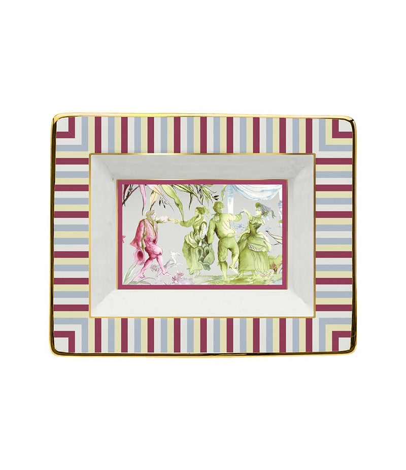 Lo svuotatasche in porcellana è un elegante e raffinato elemento di decoro. Raffigurante due coppie danzanti e felici, è realizzato in delicati colori pastello con profilo in oro.
