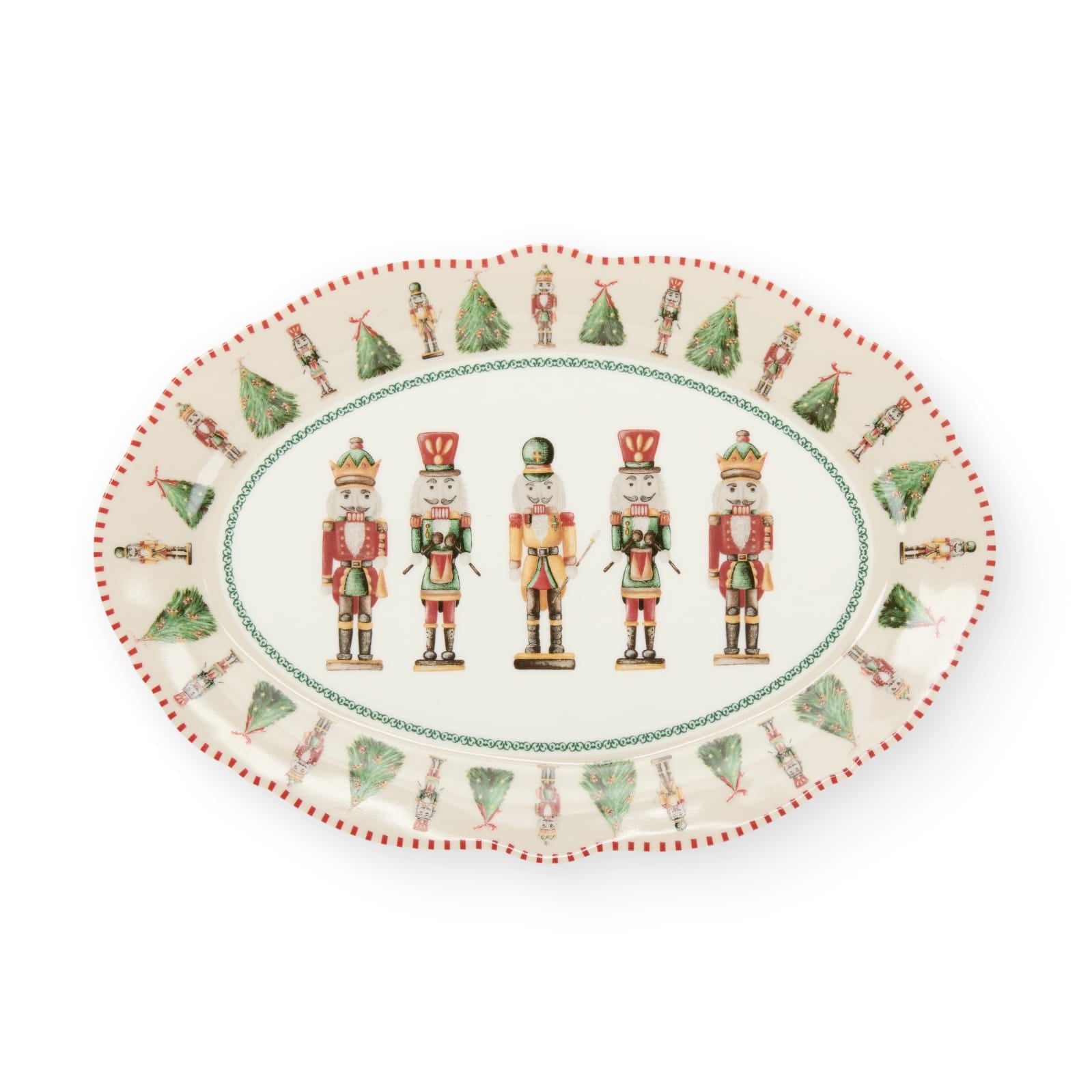 Decorato con schiaccianoci e motivi natalizi, questo vassoio ovale in porcellana è un must-have della collezione Christmas Carol di Nuvole di Stoffa.